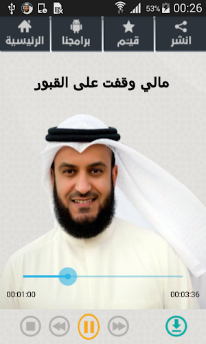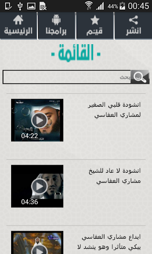 السلام عليكم و رحمة الله و بركاته,اليكم الان البرنامج الاقوى و الافضل لشيخ مشاري راشد العفاسي يحتوى البرنامج على جميع صوتيات و مرئيات الشيخ اضافة الي العديد من الميزات كتحميل و البحث