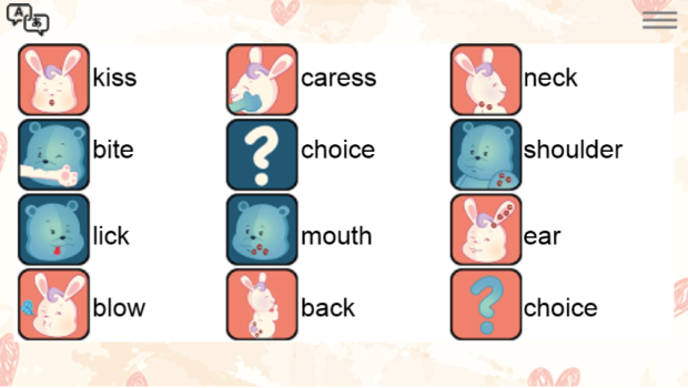 co takhle hra dvě? kostky lásky jsou kostky lásky pro každého, kdo si chce se svým partnerem či partnerkou udělat legraci, aniž by byl agresivní nebo nevkusný. obrázky dat jsou sugestivní, ale zdaleka ne nevkusné. zajíček a plyšový medvídek jsou postavy této datové lásky a navrhnou vám nějaké vtipy.hoďte kostkou! první obrázek ukazuje, co byste měli dělat: líbat, kousat, laskat, mezi jinými možnostmi, a druhá kostka, která by měla být v kapse: krk, ústa, rameno atd.. a pokud jedna z kostek vyřadí žolíka (otazník), stačí, aby si hráč nebo hráč vybral, co chcete...