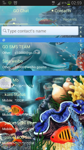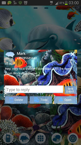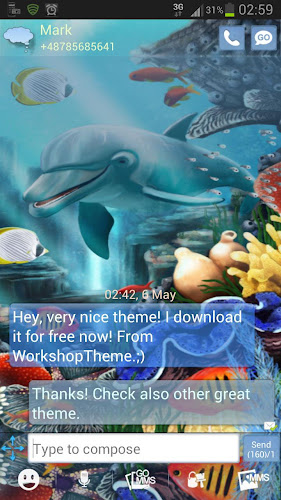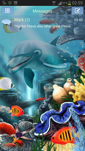 Téma mořské ryby svět je skryta před našimi zraky krásné, barevné a tajemný. Korálový útes pokrytý korálů a sasanek se zajímavými, dřevitých tvary tvoří přirozené prostředí pro velké množství druhů tropických ryb. Najdeme zde hvězdice, mořští ježci, měkkýšů, korýšů a dokonce setkat námořní želvy, delfíny a další zajímavé ryby blížící se ze vzdálených částí, jako jsou žraloci. Piercing sluneční paprsky přes vodu, krásu mořského života se stává ještě více energie. Tyto křehké ekosystémy Cay jsou jedním z nejkrásnějších přírodních krás. Duhových barvách: červené, modré, žluté, smíšené s tyrkysovou vodou, moře a oceán, a jakákoli malá ryba se stala inspirací k vytvoření této podmořské téma. Máte rádi zábavné delfínů a jejich podmořský svět nebude čekat - stáhnout a nainstalovat toto téma s Google Play zdarma.To je nejlepší aplikace pro personalizaci a přizpůsobení své GOSMS Pro.