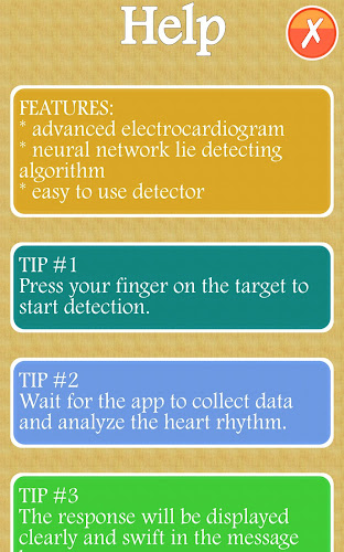 Tato aplikace je žert a je vhodná pouze pro účely zábavy.detekujte, zda člověk lže s tímto jednoduchým nástrojem. Stačí položte prst na cíl a počkejte, až aplikace analyzuje. Aplikace analyzuje váš srdeční rytmus pro detekci nervozity. Je samozřejmě vtip, nenechte se oklamat touto neuvěřitelnou simulací. prst na cíli, aby zahájil detekci.