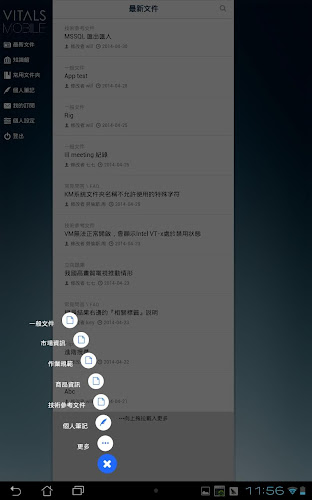 Vitals Mobile je aplikace pro správu mobilních znalostí vyvinutá společností Ruiyang Information. Uživatelé mohou procházet, načíst a přidávat nové znalostní soubory prostřednictvím mobilního zařízení do serveru systému správy znalostí Vitals ESP (Vitals/KM). Kromě toho poskytuje také osobní poznámky, které uživatelům usnadňují ukládání poznámek do mobilních zařízení, když je síť blokována, a poté je při normální připojení sítě zveřejňuje na server Vitals/KM.VITALS FUNKCE FUNKCE APP: