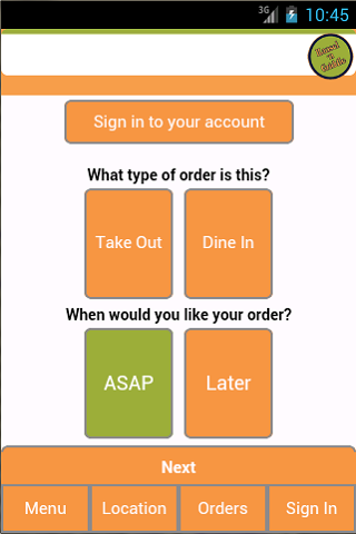 toto je aplikace pro Android pro zúčastněná místa hansel ‘n griddle, která se nachází v New Jersey a kolem něj. použijte tuto aplikaci k objednání vašeho oblíbeného produktu hansel ‘n griddle online. pro více informací nás prosím navštivte na http://www.hanselngriddle.com/a zadejte objednávku, nejprve zadejte typ objednávky a dejte nám vědět, zda si přejete objednat hned, co nejdříve, nebo objednat na později. pak klikněte na další.