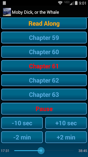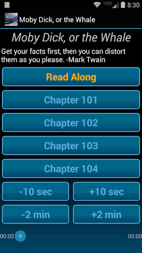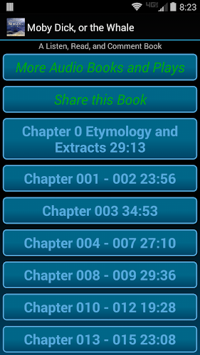 Obvyklé nahrávky mají vypravěče přečíst více než jednu kapitolu, příklad kapitol 4-6 v jednom záznamu. Jsem rád, že vám mohu poskytnout Moby Dicka kapitolu od kapitoly audioknihy, jako je skutečná kniha. A jako skutečná kniha můžete odkazovat na nejlepší online text v literatuře Network www.online-literature.com.Pokud chcete přeskočit (poprvé), nenechte si ujít začátek, kapitola 1 se staví, dokud se pequod vysílá na moře. Najděte několik zajímavých částí a poté si přečtěte kapitolu 61 Stubb zabíjí velrybu, kapitola 91 Pequod splňuje růžový-bud, kapitola 91 Ambergris, jakákoli kapitola, která má dialog, je obvykle dobré čtení.