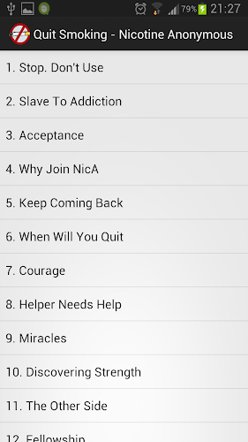 Inspirativní a motivační zvukové citace od členů Nicotine Anonymous, kteří se po mnoho let úspěšně drželi kouření. Slyšíte jejich zkušenosti a zjistěte, jak byste také mohli tuto instanci přestat kouřit.Tato bezplatná aplikace obsahuje 6 původních 21 zvukových skladeb.