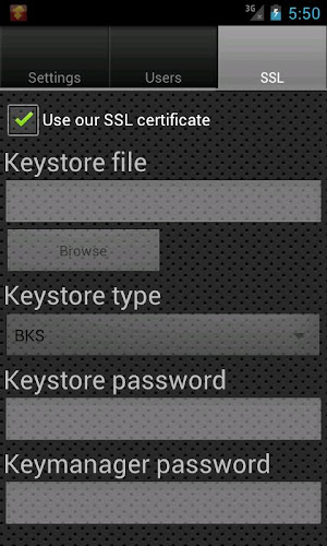 - Pokud povolíte SSL (FTPS): Použijte náš SSL certifikát, použijte vlastní klávesový typ (bks nebo pkcs12), nastavte, nastavte, nastavte, nastavte, nastavte heslo keystore, nastavte heslo keyManager