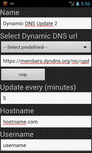 - Pro každou dynamickou aktualizaci DNS nastavte název, Timeout (v minutách), Hostitelské jméno, uživatelské jméno, Heslo a zda se aktualizovat s místní nebo veřejnou IP adresou, spusťte dynamický aktualizační DNS, když je připojen k konkrétní síti WiFi, aktualizujte změnu připojení, spusťte na boot