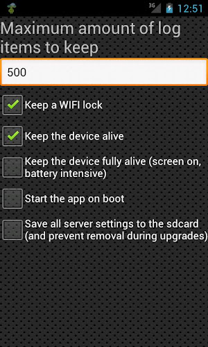 - on the settings page of the app you can set the maximum log items to keep, whether to keep a wifi lock (prevent wifi from disconnecting automatically), keep the device alive, keep the device alive full (keep the screen on, battery intensive), set to start the app on boot