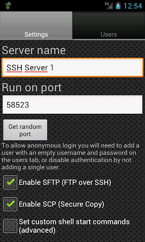 - For every SSH Server you can set name, port, multiple users, only access from certain IP addresses, vibrate on a new connection, enable logging, only log errors, start the server when connected to a specific WIFI network and disconnect when the WIFI network is lost, start on boot, max auth attempts, authorization timeout, idle timeout, max concurrent sessions (per user)