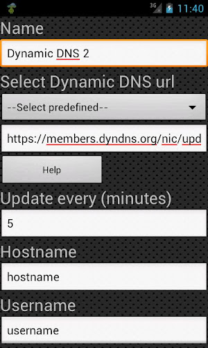 - For every dynamic DNS updater set the name, timeout (in minutes), hostname, username, password and whether to update with the local or public IP address, start the Dynamic DNS Updater when connected to a specific WIFI network, update on connectivity change, start on boot