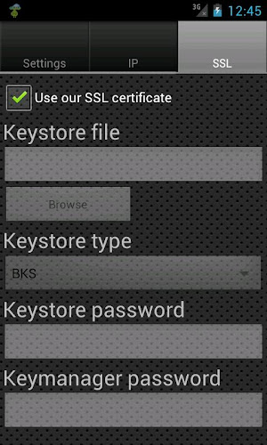- pokud povolíte SSL: Použijte náš SSL certifikát, použijte svůj vlastní klávesový typ, nastavte typ klávesstore (bks nebo pkcs12). Nastavte heslo keystore, nastavte heslo keyManager