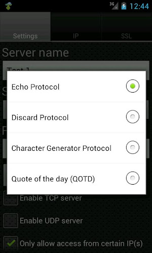 Kompletní aplikace pro testovací server! Server můžete nastavit pomocí protokolu Echo, protokolem pro vyřazení, protokol generátoru znaků (Chargen) nebo nabídkou denního protokolu (QoTD). Aplikace podporuje TCP a UDP a pro protokol TCP můžete také povolit SSL. Servery, které nastavíte, lze také nastavit tak, aby automaticky spustil, když je zařízení připojeno ke konkrétní síti WiFi!Poznámka. Pokud najdete chybu nebo máte problém, kontaktujte nás e -mailem, protože vám nemůžeme pomoci, pokud ji zveřejníte v recenzích.