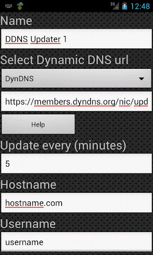 - Pro každou dynamickou DNS Updater Nastavte jméno, časový limit (v minutách), název hostitele, uživatelské jméno, heslo a zda se aktualizovat s místním nebo veřejná adresa IP, spusťte dynamický aktualizační Adater DNS, když je připojen k konkrétní síti WiFi, aktualizujte změnu připojení, spusťte na boot