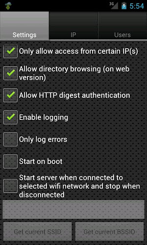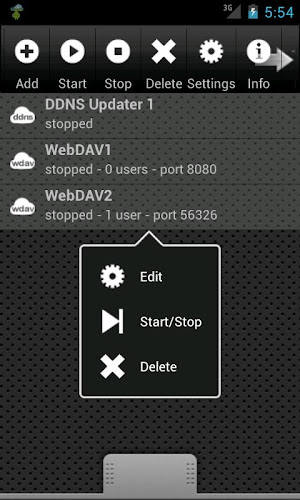 - pro každý webdav server můžete nastavit název, port, přístup pouze z určitých IP adres, povolit protokolování, pouze protokolovat chyby, použít také ověřování http digest, povolit výpis adresářů pro webovou verzi, spustit server při odpojení ke konkrétní wifi síti a pokud se ztratíte { https#}: ssl certifikát, použít vlastní úložiště klíčů, nastavit typ úložiště klíčů (bks nebo pkcs12), nastavit heslo úložiště klíčů, nastavit heslo správce klíčů