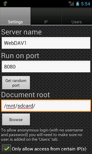 jednoduchý, bezpečný a kompletní webdav server! aplikace podporuje přidávání více uživatelů, má podporu webdav over ssl/tls (https) a lze ji nastavit tak, aby automaticky spouštěla webdav server, když je vaše zařízení připojeno ke konkrétní wifi síti!poznámka. někteří webdav klienti nemohou zpracovávat uživatele, pokud máte potíže s připojením k webdav serveru, zkuste odstranit všechny uživatele, což znemožní autentizaci. pokud máte stále problémy, kontaktujte nás, abychom se vám mohli pokusit pomoci.