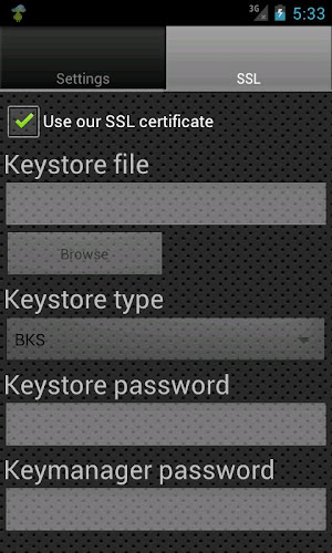 - Zajistěte spojení s SSL (TLS) a použijte náš vestavěný v certifikátu nebo použijte vlastní certifikát (použijte vlastní certifikát ( BKS a PKCS12 podporovány)