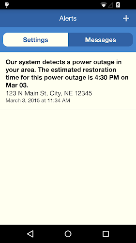 • Zobrazit mapu výpadku - aplikaci lze také použít k zobrazení mapy výpadku NPPD. Za normálních podmínek ukazuje mapa oblast, které jsou v současné době ovlivněny výpadkem, počet postižených zákazníků, status posádky a odhadovanou dobou obnovy, jakmile budou informace k dispozici. Pokud se objeví rozsáhlé výpadky nebo pokud se očekává, že počasí způsobí výpadky napájení, může NPPD také zobrazit informace na domovské stránce aplikace nebo distribuovat zpravodajství, které jsou přístupné z aplikace. „Můj účet“ umožňuje uživatelům vidět jejich elektrickou spotřebu, historii fakturace a získat kopie účtů. Můžete se také zaregistrovat k fakturaci bez papíru a nechat své měsíční platby přijmout přímo z vašeho kontrolního nebo spořicího účtu nebo mít přístup k platbě debetem nebo kreditní kartou. Zákazníci zaregistrovaní pro tuto funkci také obdrží oznámení, pokud dojde k aktualizaci stavu výpadku a při obnovení energie. (Zákazníci s více účty musí zaregistrovat každý účet, pro který chtějí dostávat upozornění.) Jednoduše klepněte na kartu „Nastavení“ a poté „+“ přidejte účet. Po potvrzení můžete tlačítko snadno přejeďte doprava a zaregistrujte se pro upozornění. Pokud jsou přijata oznámení, jednoduše klepnutím na kartu „Zprávy“ si přečtěte zprávu o oznámení.