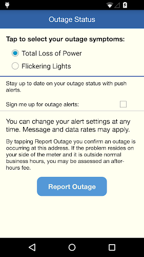 • Zpráva o výpadcích napájení/zkontrolujte stav výpadku - se zadáním některých jednoduchých informací pro identifikaci vašeho účtu usnadňuje výpadky napájení a kontrolu stavu napájení pro váš elektrický účet.