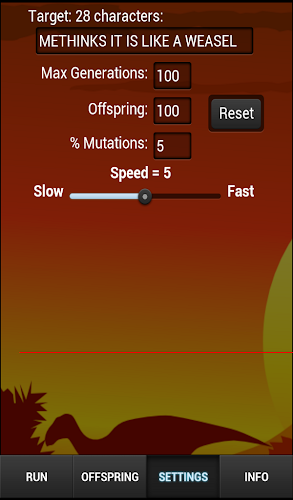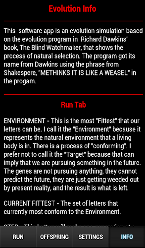 Tato softwarová aplikace je simulací evoluce založená na programu Evolution v knize Richarda Dawkinsa The Blind Watchmaker, která ukazuje proces přirozeného výběru. Program získal své jméno od Dawkins pomocí fráze od Shakespeara, „methinks je to jako lasička“ v programu. Cílem programu je prokázat, že zachování malých změn ve vyvíjejícím se řetězci znaků (nebo genů) může produkovat smysluplné kombinace v relativně krátké době, pokud existuje určitý mechanismus pro výběr kumulativních změn, ať už je to osoba, která identifikuje, které vlastnosti jsou žádoucí (v případě umělého výběru) nebo v případě přirozeného výběru). Reprodukční systémy mají tendenci zachovávat rysy napříč generacemi, protože potomci zdědí kopii rysů rodičů. Jsou to rozdíly mezi potomky, změnami kopírování, které se stávají základem pro výběr, což umožňuje přežití frází blíže cíli a zbývající varianty „zemřít“. Zařízení můžete zkontrolovat pomocí aplikace Syscheck.V Současné Době Nabízíme Verzi 1.0.0. Toto Je Naše Nejnovější, Nejvíce Optimalizovaná Verze. Je Vhodný Pro Mnoho Různých Zařízení. Zdarma Ke Stažení Přímo Apk Z Obchodu Google Play Nebo Jiných Verzí, Které Hostujeme. Kromě Toho Si Můžete Stáhnout Bez Registrace A Bez Nutnosti Přihlášení.