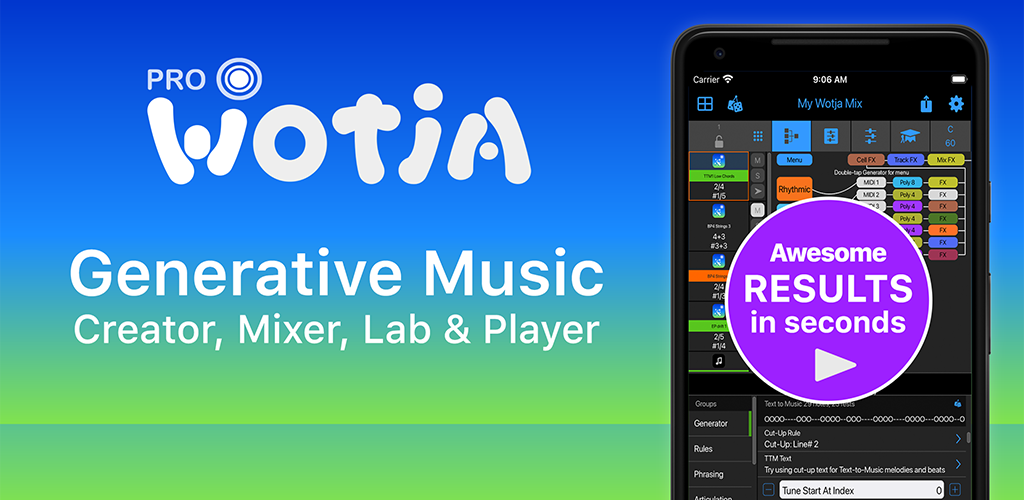 pomocí wotja snadno vytvářejte a přehrávejte živou ambientní hudbu, pohodová pozadí, svěží drony, zvukové scenérie, melodie, nápady, „text to music“, beaty, midi a mnoho dalšího…každý rok je tu nová verze wotja. v roce 2021 je to verze 21. placená aplikace „pro“ pro zařízení se systémem Android v roce 2021 se proto nazývá „wotja pro 21“. 21?