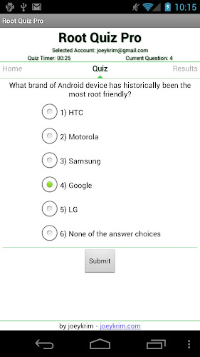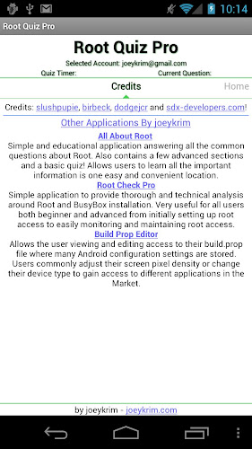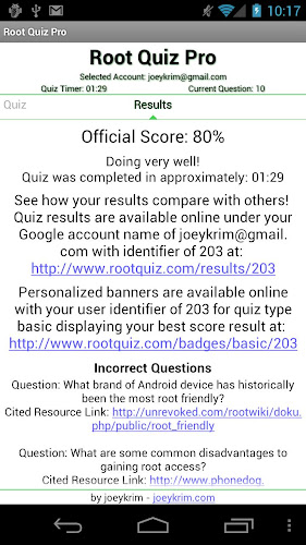 Verze Pro také poskytuje otázky zmeškané spolu s odkazy na zdroje, aby se naučily odpovědi. Kompletní sada nástrojů pro zlepšení a získávání znalostí týkajících se přístupu kořenů na zařízení Android. Chcete -li zobrazit výsledky: http://www.rootquiz.com/badges/adges