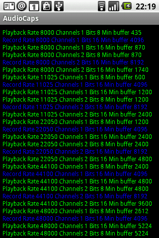 Vytiskne seznam podporovaných formátů nahrávání a přehrávání na zařízení Android. N/AV1.4 potvrzuje schopnost přehrávání/záznamu odesláním/přijímáním vzorků do zvukového hardwaru