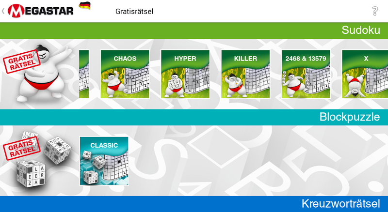 Aplikace Megastar nabízí mnoho populárních typů hádanek.