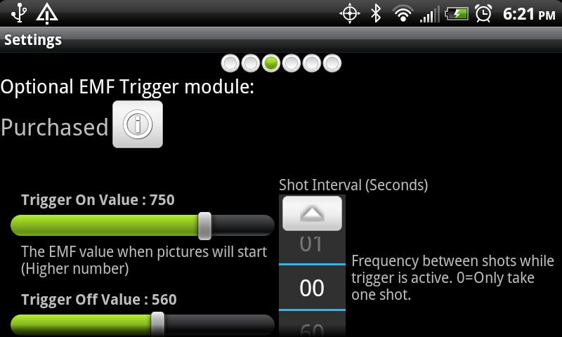 spoušť emf – spouští fotoaparát na základě hodnot elektromagnetického pole načtených ze snímače elektronického kompasu telefonu. lze vybrat počáteční a koncové hodnoty.