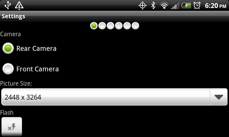 v nastavení můžete nastavit, který fotoaparát se má použít (zadní nebo přední), velikost snímku a režim blesku.
