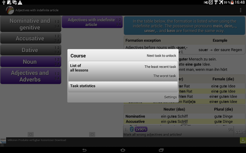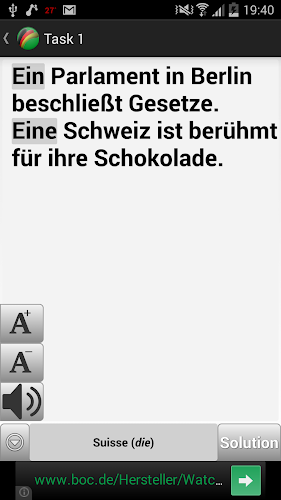Můžete okamžitě použít v praxi, co jste si přečetli a okamžitě získáte zpětnou vazbu. Ve všech úkolech se používají německé fráze. V současné době existuje více než 6000 (20-200 pro úkol) věty pro dostupná cvičení. if you do not know a word in your language, translations are available from a database.