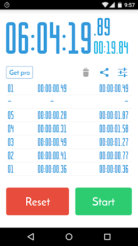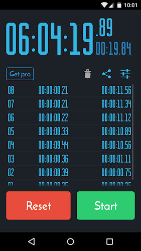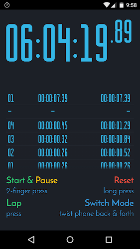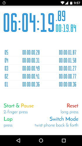 Stopky Re je elegantní stopky aplikace obsahuje obě fullscreen (no-tlačítko) a režim velké tlačítko, v celoobrazovkovém režimu, stopky lze ovládat pouhým poklepáním na celou obrazovku, není třeba dívat se na telefonu klikněte na tlačítko.No ad verze: https://play.google.com/store/apps/details?id=com.leavjenn.stopwatchre