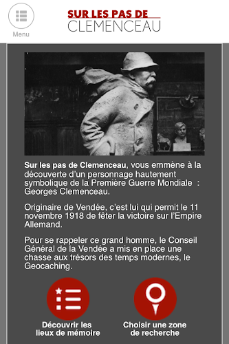 po stopách Clemenceau: vydejte se objevovat místa Clemenceau ve Francii!generální rada Vendée vás zve, abyste objevili emblematickou postavu první světové války: Georges Clemenceau (1841-1929). Díky této aplikaci a vybavené GPS souřadnicemi se vydáte na hon za obsahem skrytým na různých místech vypůjčených z její paměti. jakmile je najdete, obohatíte své znalosti o postavě a... historii Francie! originální a zábavný způsob, jak se kultivovat.