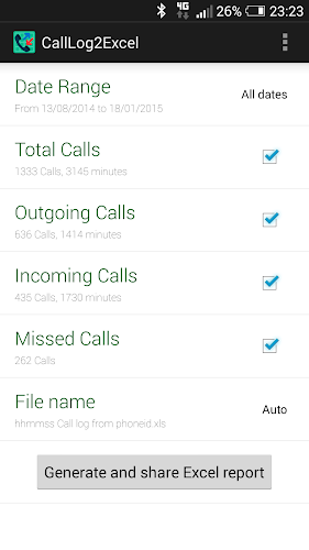 pouze jedním klepnutím vygenerujete zprávu o historii hovorů ve formátu Excel a můžete ji sdílet poštou, nahrát do cloudu, uložit do zařízení nebo cokoli jiného, co chcete s těmito užitečnými informacemi dělat. můžete také použít užitečné filtry, jako jsou rozsahy dat nebo typy hovorů.