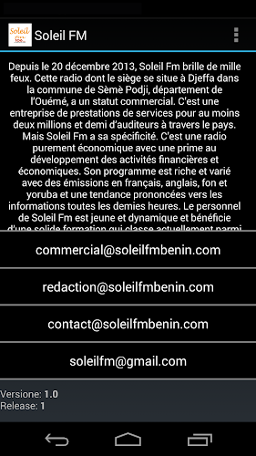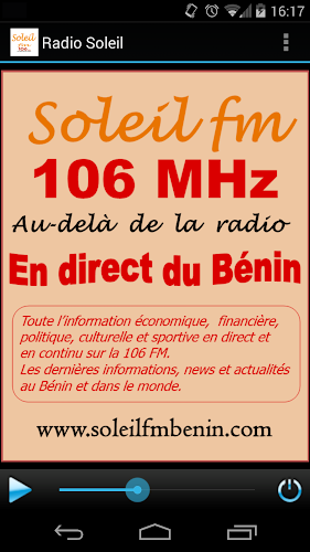 Od 20. prosince 2013 SUN FM ukázal tisíc světel. Toto rádio, jehož ústředí se nachází v Djeffa v komunitě Sèmè Podji, Katedra Ouémé, má komerční status. Je to servisní společnost pro nejméně dva a půl milionu posluchačů po celé zemi. Ale Sun FM má svou specifičnost. Je to čistě ekonomické rádio s prémií pro rozvoj finančních a ekonomických činností. Její program je bohatý a různorodý s emisemi ve francouzštině, angličtině, fon a Yorubě a trendu vyslovovaným k informacím každé půl hodiny je personál FM Sun mladý a dynamický a těží z solidního tréninku, který v současné době v současné době klasifikuje mezi nejlepšími v Beninise Media Platform. Zkušenost je zajímavá pro všechny herce tohoto kanálu, kteří jen sní o jeho umístění v hlavě beninského rádia. vyvinout jiné typy akcí, které je postaví v srdcích milovníků hudby.V Současné Době Nabízíme Verzi 1.1. Toto Je Naše Nejnovější, Nejvíce Optimalizovaná Verze. Je Vhodný Pro Mnoho Různých Zařízení. Zdarma Ke Stažení Přímo Apk Z Obchodu Google Play Nebo Jiných Verzí, Které Hostujeme. Kromě Toho Si Můžete Stáhnout Bez Registrace A Bez Nutnosti Přihlášení.