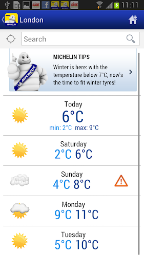 • Driving podmínky (počasí) : Zkontrolujte předpověď počasí a získejte upozornění za povětrnostní podmínky, abyste mohli lépe naplánovat své cesty