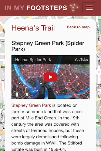 Prostřednictvím tohoto procesu, oni vytvořili své vlastní trasy - mini pěší výlety, vede nás prostřednictvím fascinujících Cesty za poznáním, nápaditě tkaní spolu osobní příběhy a vzpomínky s oficiálními záznamy historie. Díky této zakázku mobilní aplikace, v mém stopách shromáždil a konzervována těchto fascinujících tras tak, aby ostatní mohli prozkoumat je, prakticky stejně jako v reálném světě.