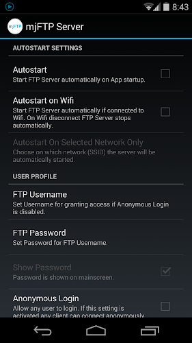 může běžet plně automatizovaný na pozadí. Pokud se WiFi připojí / odpojený server FTP spustí / zastaví automaticky (nastavení goto pro aktivaci této funkce).