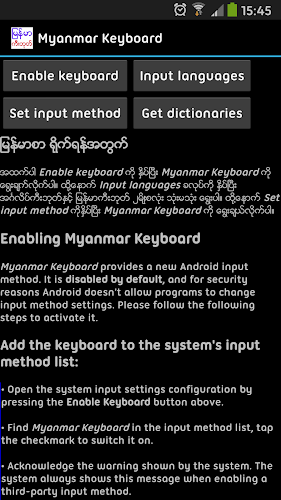 Analýza A Revize Aplikací Pro Android: Myanmar Keyboard, Vyvinuté Společností Myanmar Keyboard Developer. Uvedeno V Kategorii Nástroje. Aktuální Verze Je v0.07, Aktualizována Na 06/03/2014 . Podle Recenzí Uživatelů Na Google Play: Myanmar Keyboard. Dosaženo Více Než 1000 Tisíc Instalací. Myanmar Keyboard Má V Současné Době Recenze 9 Tisíc, Průměrné Hodnocení 4.1 Hvězd