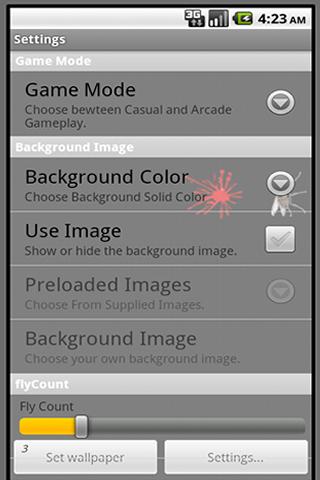 herní režim: rozbijte všechny mouchy na obrazovce a sledujte, jak vaše skóre raketově stoupá. ale pozor, mouchy jsou tím rychlejší, čím vyšší je vaše skóre.