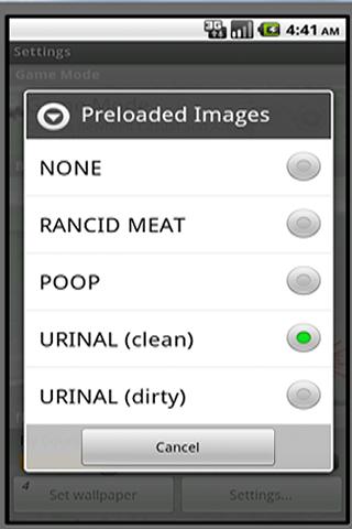 pro pozadí si vyberte z libovolných barev, nebo možná vyzkoušejte jeden z našich předem nahraných obrázků (žluklé maso, pisoár (čisté i špinavé varianty) nebo hovínka). mouchy je všechny milují.