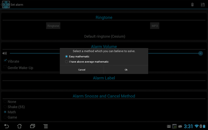 • Vyřešit matematický problém, který zamítne nebo odloží budík, můžete také vybrat úrovně obtížnosti