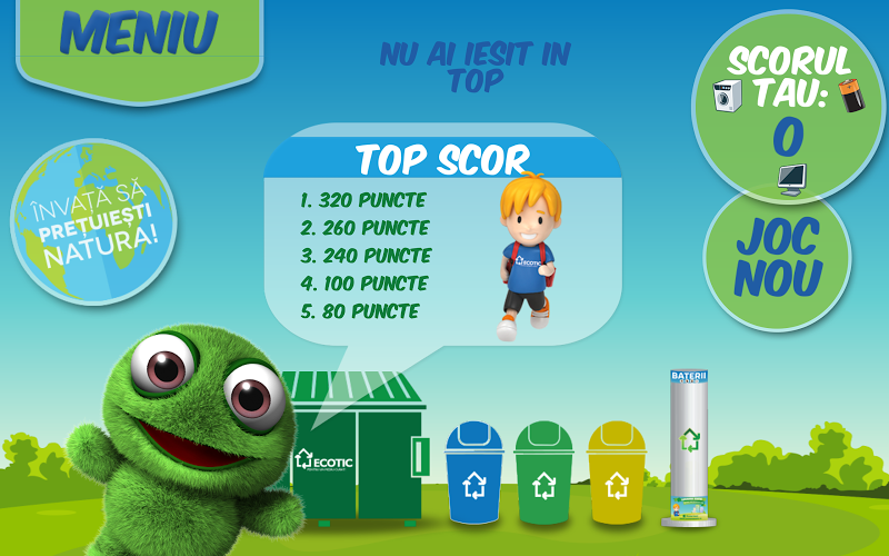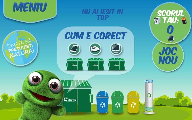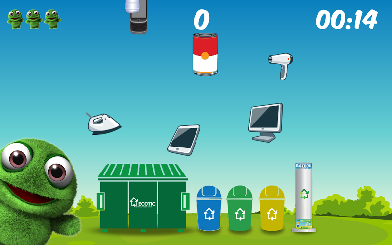 Účel hry se skládá ze správné sběru odpadu. Každý objekt (baterie, vysavač, brožura, pet, sklo) musí dosáhnout nádoby, do které patří (baterie, spotřebiče, papír, plast, sklo). Ztratíte život ze tří, při každém odpadu hodený špatně. Úspěch!Copyright The Ecotic Association.
