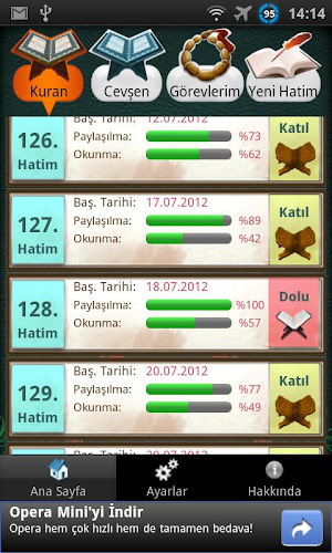 Program může být sdílen mezi uživateli Koránu a Cevşen Hatims. S touto aplikací, vaše modlitební časy pro uživatele Android a iOS s sdílením Hatim Uyugl Amalarini mezi lidmi, kteří používají http://apps.facebook.com/onlinehat,...