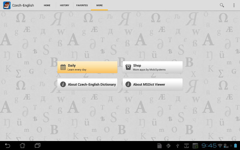 Analýza A Revize Aplikací Pro Android: Czech<>English Dictionary, Vyvinuté Společností MobiSystems. Uvedeno V Kategorii Knihy A Referenční Materiály. Aktuální Verze Je 4.3.089, Aktualizována Na 23/04/2014 . Podle Recenzí Uživatelů Na Google Play: Czech<>English Dictionary. Dosaženo Více Než 1 Tisíc Instalací. Czech<>English Dictionary Má V Současné Době Recenze 1, Průměrné Hodnocení 5.0 Hvězd