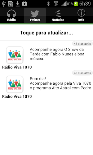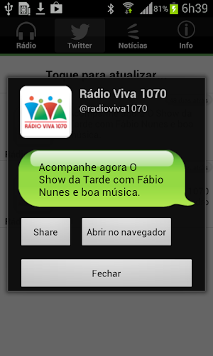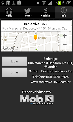 radio viva fm je ve státě rs špičkou. Ve svých programech hraje to nejlepší z populární a country hudby. Je uznávána v celém státě Rio Grande do Sul pro své charisma jako komunikátor a pro přinášení informací a zábavy do komunity.Líbila se vám aplikace? dejte like naší stránce https://www.facebook.com/devmobsolution