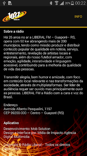 26 let ve vysílání liberální fm - guaporérs, provozuje 50 kw pokrývající více než 200 obcí, s posláním produkovat a distribuovat populární obsahové zprávy v oblasti kvality, služeb, zábavy, rozvoje místních a regionálních umělců, nad rámec našehoamatérského fotbalu s emocemi, rychlostí, interaktivitou, přístupným jazykem, přispívat ke zlepšení kvality života zaměřeného na místní pessy, dobrý humor, dobrý humor, transmisy. transformace společnosti prostřednictvím multiplatform.