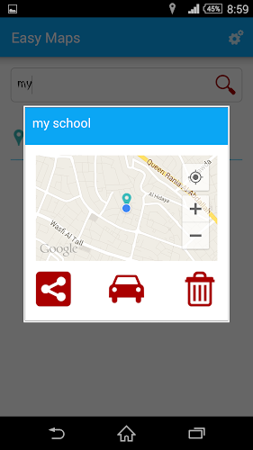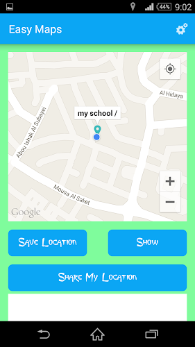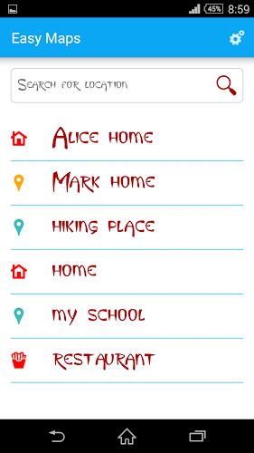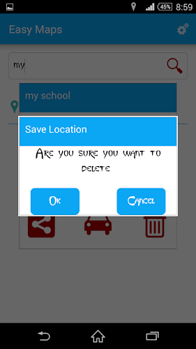 Tato jednoduchá aplikace pro vaše zařízení pro Android vám umožňuje snadno používat mapy Google, ukládat a sdílet svá vlastní místa E/G (práce, škola) atd. drive directly to your location from easy maps.features: