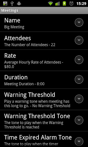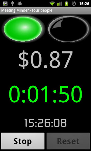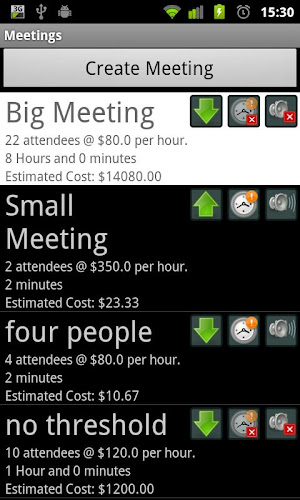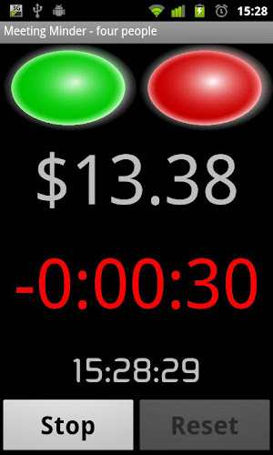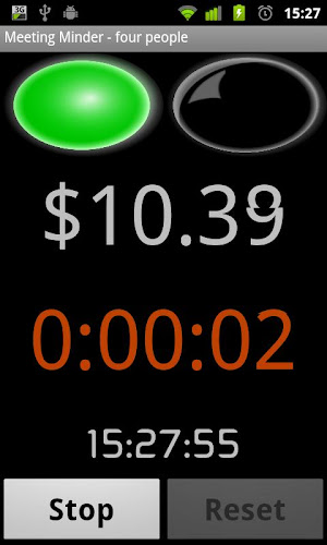 Ten people for 90 minutes every Monday? It adds up, and it helps keep people focused and speeds up meetings when people can see the dollars clocking up.Meeting Timer displays visually how much your meeting is costing, with optional audio and visual alerts to warn people to finish up, and tell everyone that time's up.