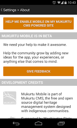 mukurtu 1.5 bylo vydáno v březnu 2014 pro chytré telefony a tablety Android. nabízíme nepřetržitou podporu, nepřetržitý vývoj a těšíme se na zpětnou vazbu od naší komunity.