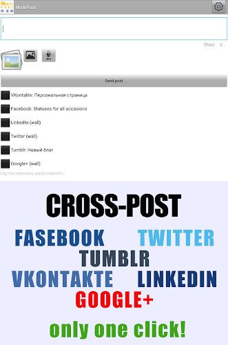 Scheduled Cross-Posting messages to your walls in VKontakte and Twitter with one click!You can post messages: