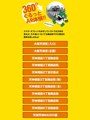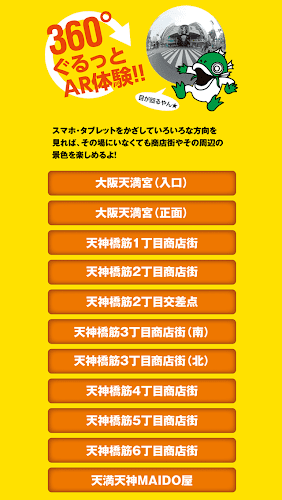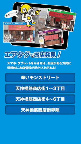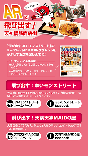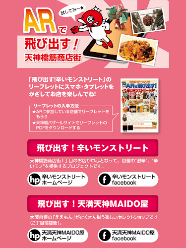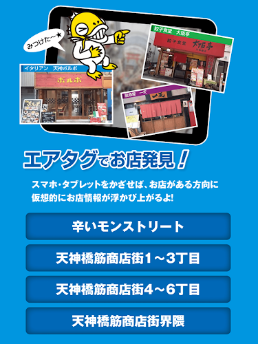 Zažijte nákupní ulici Tenjinbashisuji s AR!Aplikace „Tenjinbashi Bazaar“ je bezplatná aplikace, která vám umožní nejen vychutnat si informace o nejdelší nákupní ulici v Japonsku Tenjinbashisuji, ale také ji „zažít“ v AR* na vašem chytrém telefonu nebo tabletu.